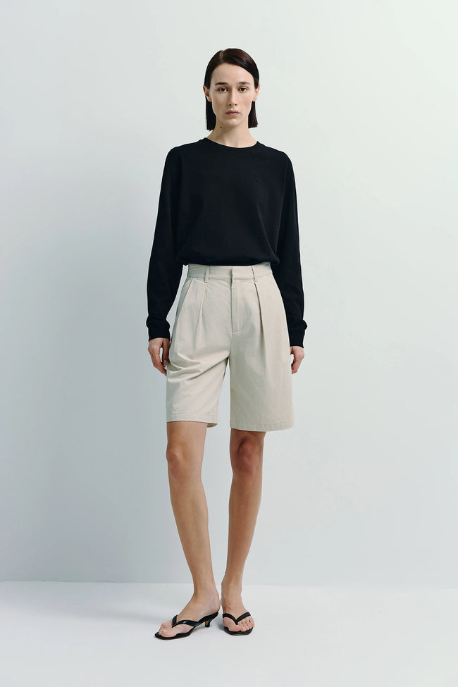 Beige Darrion Bermuda shorts. Cotton-lyocell blend, tailored fit for women. Woman in black top and beige Darrion Bermuda Shorts. Breathable cotton-lyocell blend for refined styling.